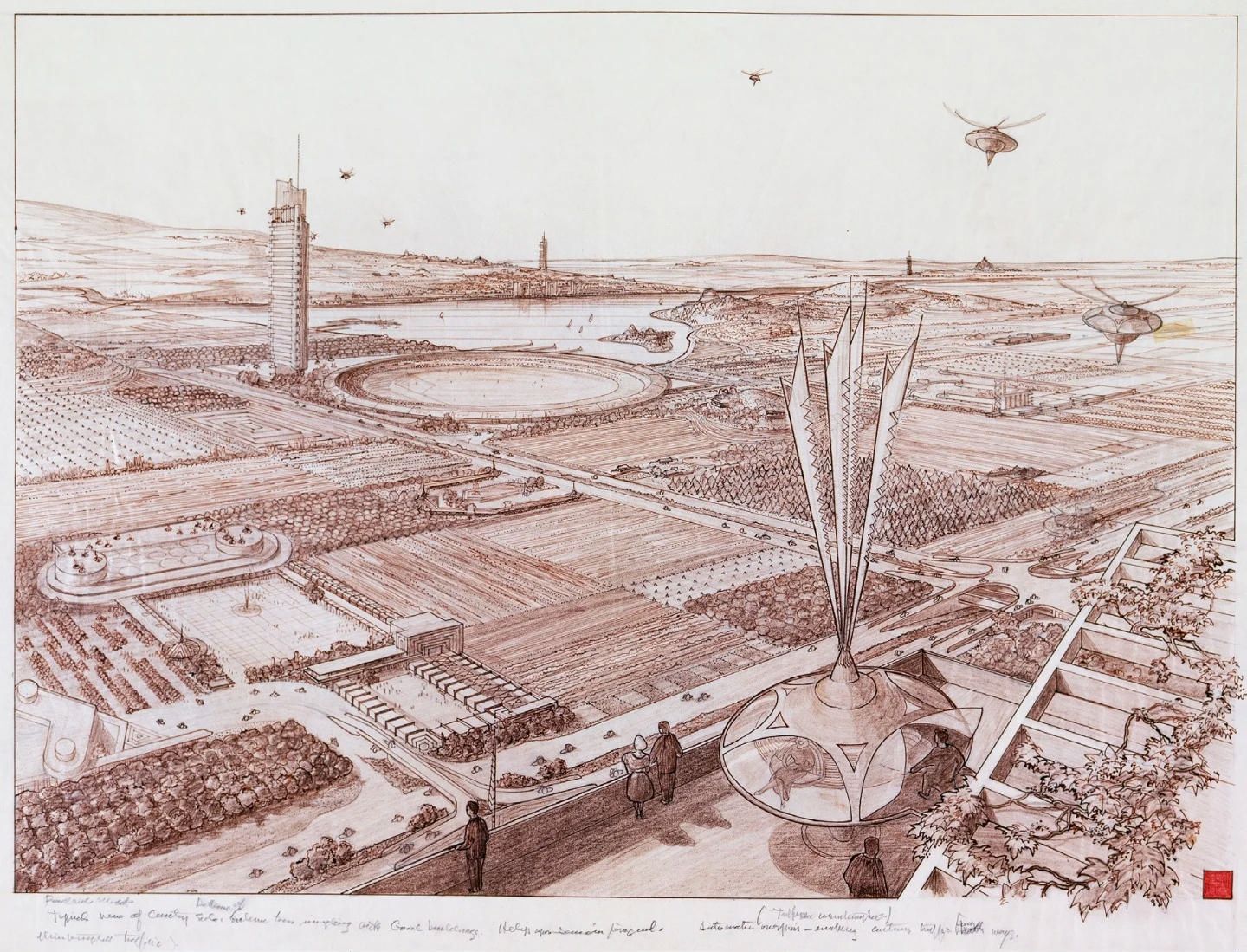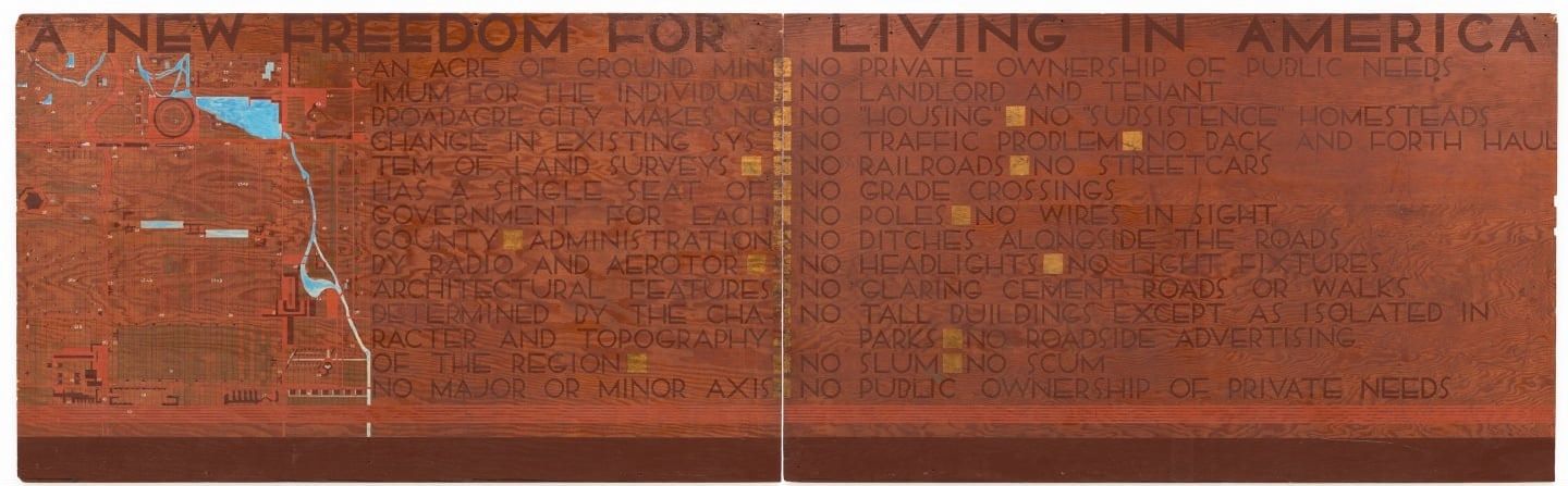 Frank Lloyd Wright’s Broadacre City, first presented to the public in 1935, was a provocative and comprehensive vision for the reorganization of the entire American landscape. Conceived as a direct response to the social and spatial inequities of industrial cities, Broadacre proposed a radical model of decentralization rooted in the ideals of Jeffersonian democracy and individual autonomy. At the heart of Wright’s proposal was the belief that each American family should have access to a one-acre plot of land, enabling them to live, work, and cultivate in harmony with the landscape. This spatial arrangement, supported by the rise of the automobile and advances in telecommunications, would dissolve the rigid hierarchies of the modern city and replace them with a distributed network of self-sufficient homesteads. Broadacre City challenged prevailing notions of urbanism by rejecting density, centralization, and corporate control. Instead, it envisioned a society grounded in small-scale agriculture, localized manufacturing, and direct democratic governance. Wright called for the individual ownership of homes and workplaces, while advocating public control over utilities such as power, transportation, and monetary systems. In doing so, he sought to dismantle the economic and spatial systems that enabled absentee ownership and unearned privilege. Importantly, Wright did not view the city merely as a collection of buildings and infrastructure, but as a living “society in action.” Although the project was never realized, the concept of Broadacre City became a statement on the role of architecture and planning in shaping a more equitable, spiritually grounded, and human-centered civilization.