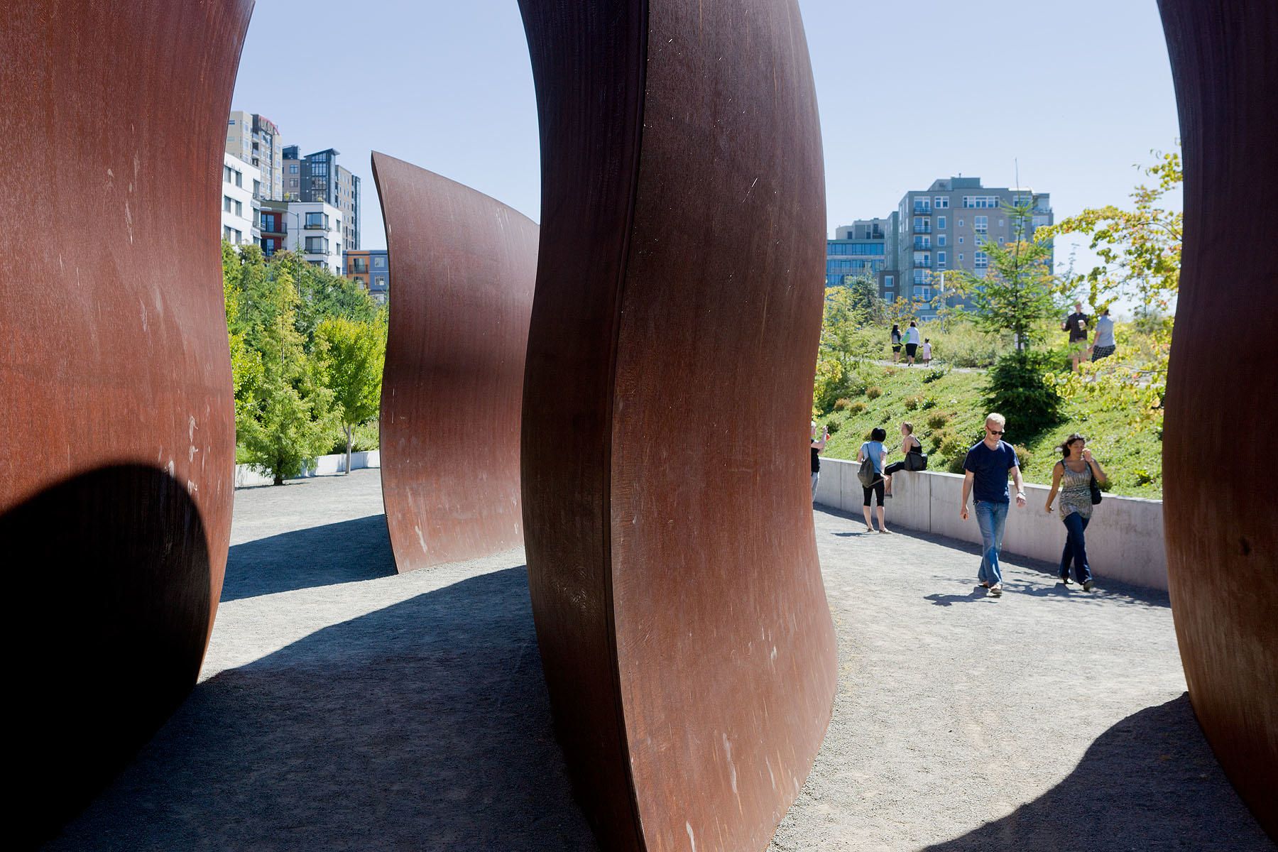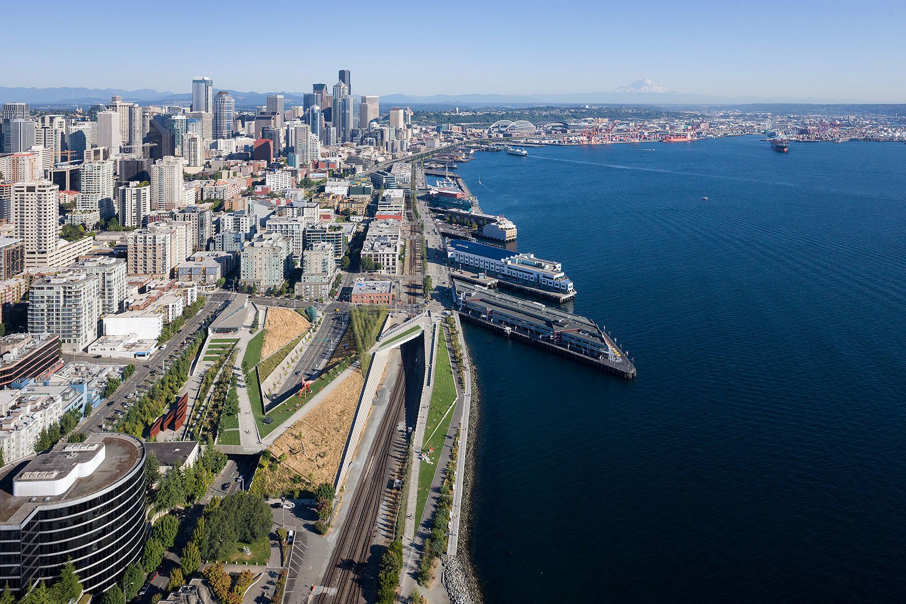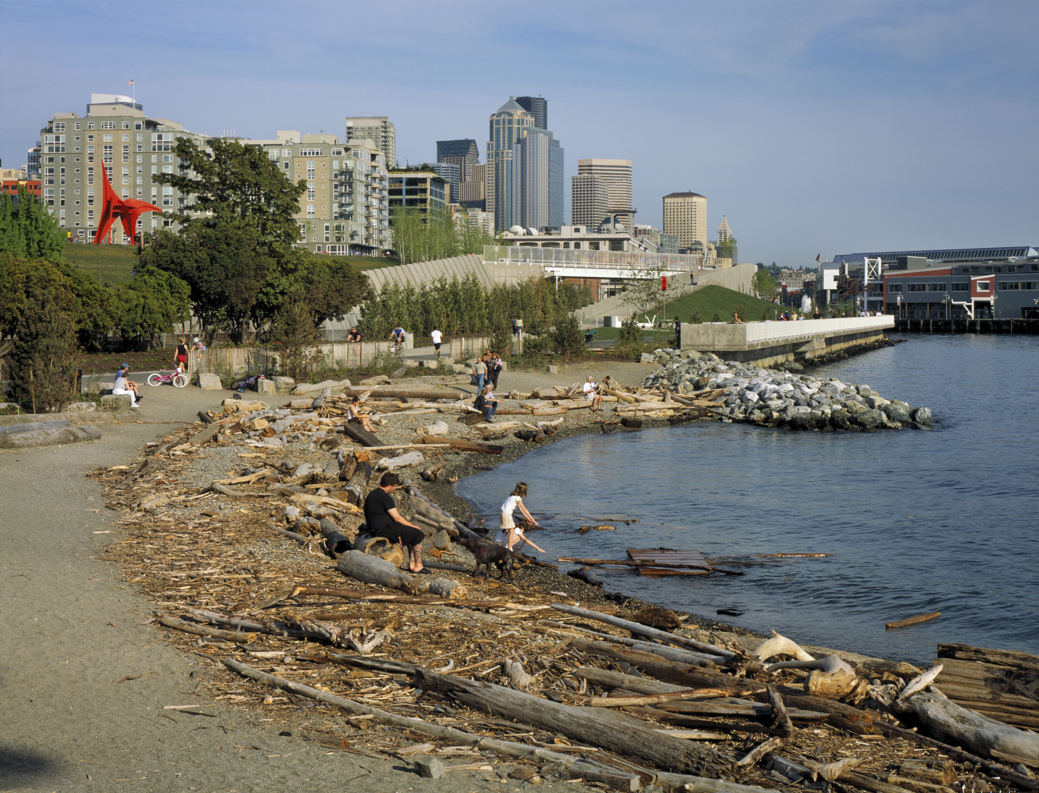 The Olympic Sculpture Park joins the efforts of multiple skills in design, landscape planning, and engineering. The Z-shaped park is situated in a complex infrastructural node, creating pedestrian access to the open space on different levels while overcoming the terrain topography. By combining the urban fabric, the existing infrastructure, and the waterfront, the project represents an urban amenity with the potential to recover the Seattle center Waterfront. The project intervened in an urban condition radically transformed by industrial development after the late Nineteenth century. The site was used primarily for industrial purposes until the 1960s and 1970s. More recently, after residential speculation caused by the proximity to the waterfront, the area - destined to become a private development -became a free public open space under the ownership of the Seattle Art Museum. Olympic Sculpture Park is not only a green space; it is also a sculpture garden in an urban setting, a direct extension of the Seattle Art Museum, which displays part of its sculpture collection there. In addition, the park is characterized by the presence of two buildings that enhance the system of open spaces: the Weiss/Manfredi pavilion, which houses museum activities, and the Neukom Vivarium, by artist Mark Dion, which includes a 60-foot-long nurse log.