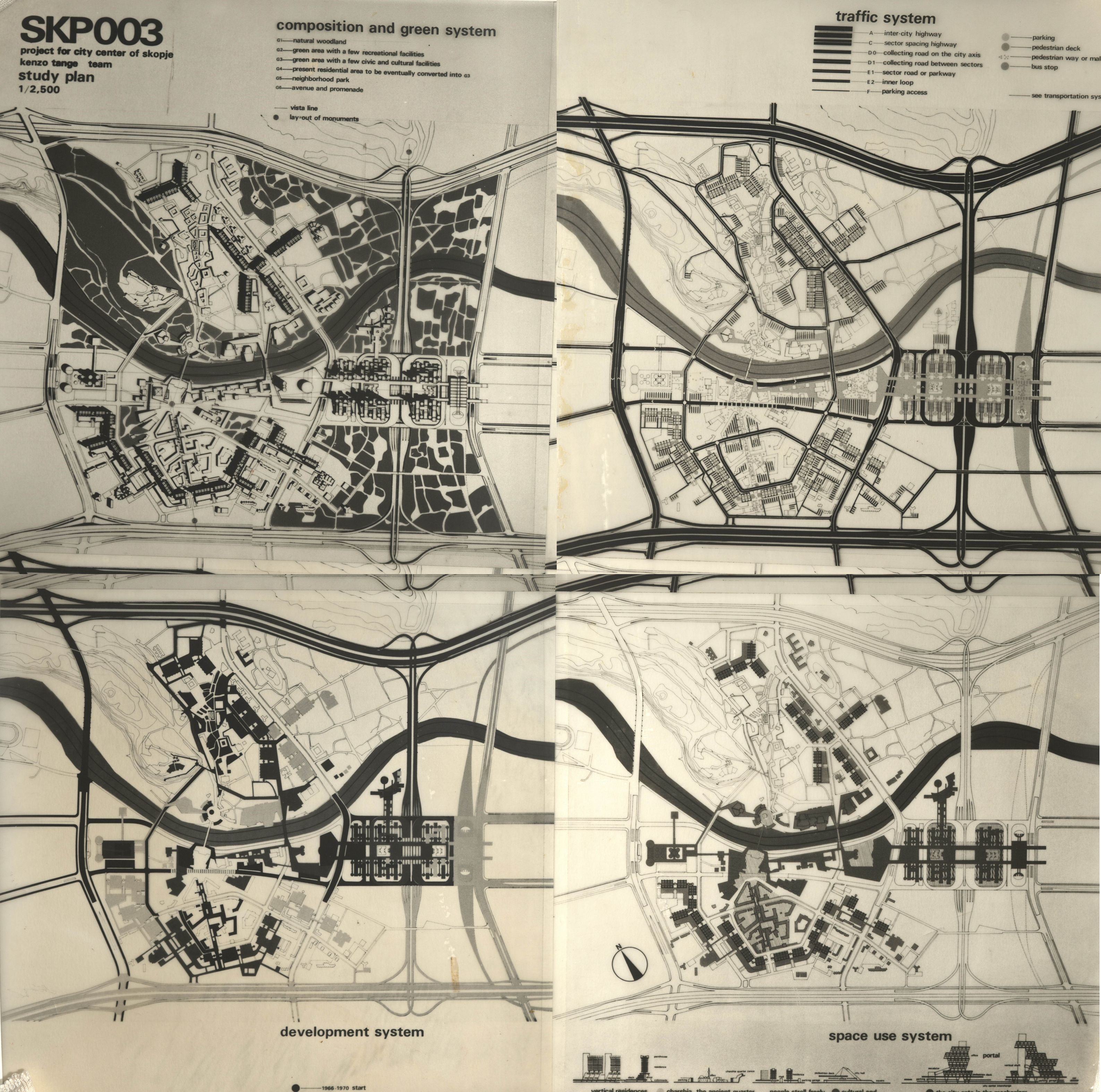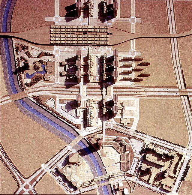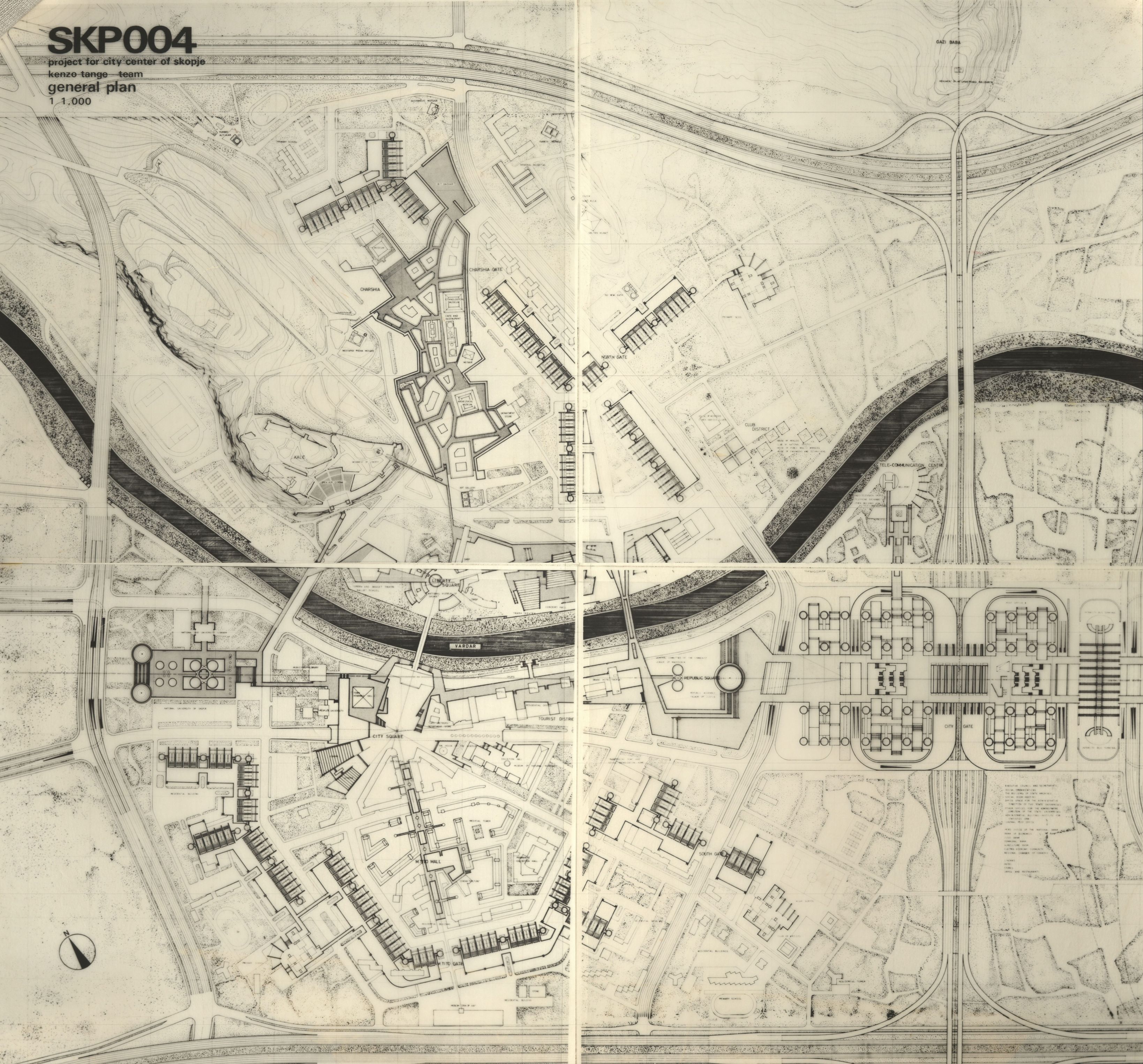 On 26 July 1963, a devastating earthquake struck the Yugoslav city of Skopje, destroying over 75 percent of the city. It prompted an international response led by the UN Special Fund. A master plan was developed through the Town Planning Project, including an international competition to redesign the city center. Kenzo Tange’s team won first prize and shaped the vision for a modern, post-disaster Skopje. The plan for Skopje demonstrated the remarkable continuity of Tange's approach to city design. Tange's proposal was based on two metaphorical concepts, the "City Gate" and "City Wall," through which Tange developed and released in Skopje the striking planning ideas he began in his Tokyo Bay proposal. They referred to the two major elements of the city with distinct characters. The proximity of residential areas to the business district was expected to bring vitality back to the city. The concept of City Gate was based on a linear axis concentrating all urban functions related to communication and business operation. In the middle of this stretch was a gigantic gateway structure resembling incoming traffic from regional highways. The axis ended at Republic Square, Skopje's principal civic space on the River Vardar and surrounded by state and municipal facilities. Skopje’s master plan focused on post-disaster reconstruction, using megastructures, integrated transit, and modular zoning to shape a modern and adaptable city center. While the City Wall was never fully realized due to limited socialist funding and political changes, the plan established a structured urban framework that reflected the ambitions of functionality and flexibility in a post-war socialist city.